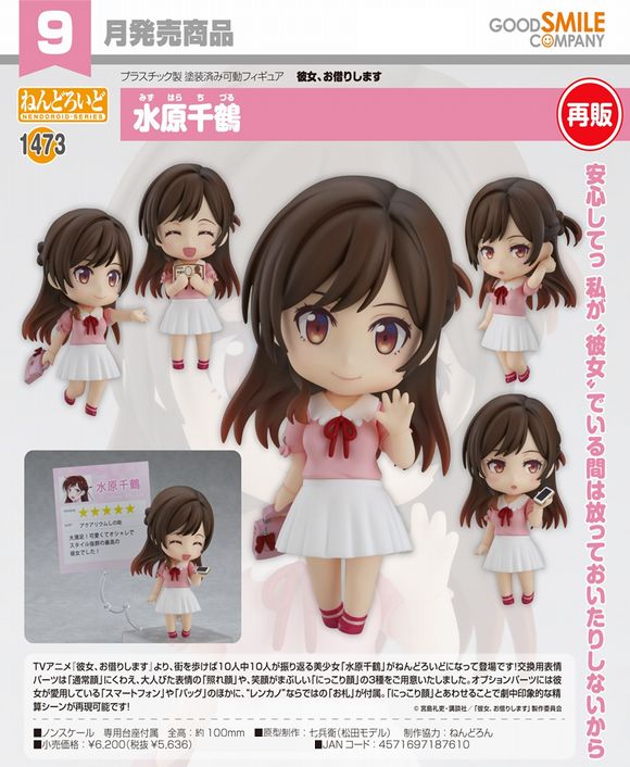 TVアニメ『彼女、お借りします』より、街を歩けば10人中10人が振り返る美少女「水原千鶴」がねんどろいどになって登場です!交換用表情パーツは「通常顔」にくわえ、大人びた表情の「照れ顔」や、笑顔がまぶしい「にっこり顔」の3種をご用意いたしました。オプションパーツには彼女が愛用している「スマートフォン」や「バッグ」のほかに、“レンカノ”ならではの「お札」が付属。「にっこり顔」とあわせることで劇中印象的な精算シーンが再現可能です!ねんどろいどになった”理想の彼女”「水原千鶴」とたくさんのデートをお楽しみください!
