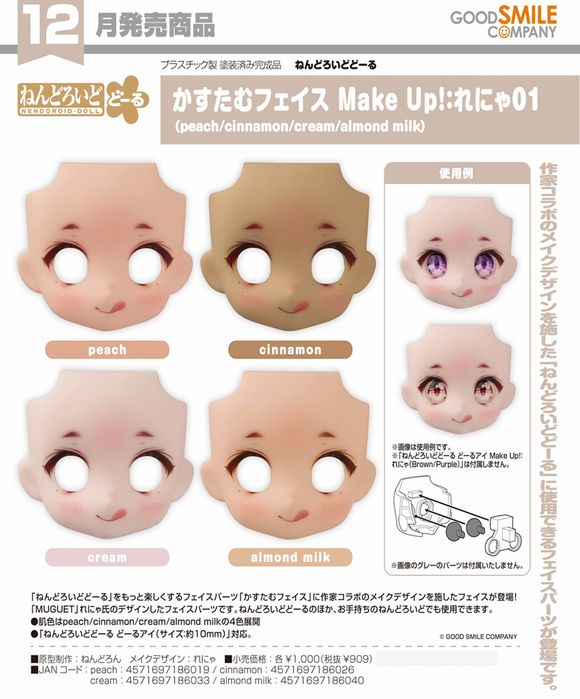「ねんどろいどどーる」をもっと楽しくするフェイスパーツ「かすたむフェイス」に作家コラボのメイクデザインを施したフェイスが登場!「MUGUET」れにゃ氏のデザインしたフェイスパーツです。ねんどろいどどーるのほか、お手持ちのねんどろいどでも使用できます。
