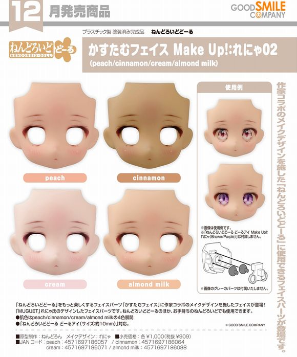 「ねんどろいどどーる」をもっと楽しくするフェイスパーツ「かすたむフェイス」に作家コラボのメイクデザインを施したフェイスが登場!「MUGUET」れにゃ氏のデザインしたフェイスパーツです。ねんどろいどどーるのほか、お手持ちのねんどろいどでも使用できます。