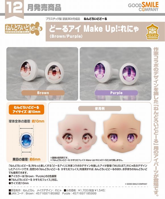 「ねんどろいどどーる」をもっと楽しくする「どーるアイ」に作家コラボのデザインを施したアイが登場!「MUGUET」れにゃ氏のデザインしたアイパーツです。別売りの「ねんどろいどどーる かすたむフェイス」を使用すれば、ねんどろいどどーるのほか、お手持ちのねんどろいどでも使用できます。