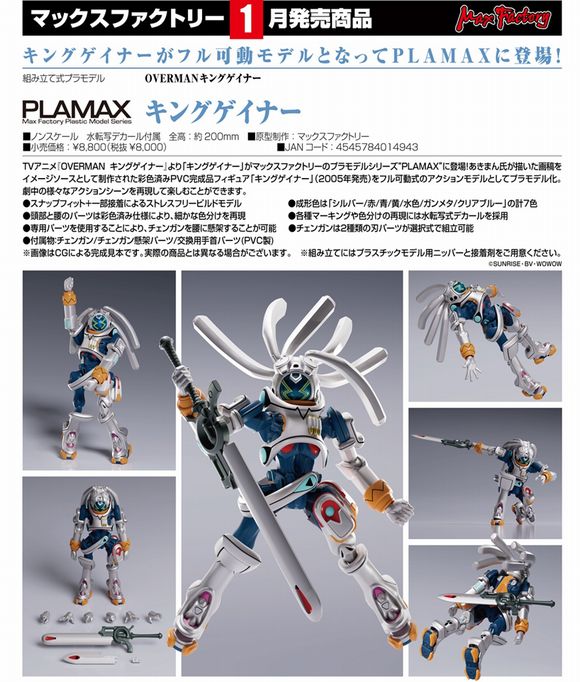 TVアニメ『OVERMAN キングゲイナー』より「キングゲイナー」がマックスファクトリーのプラモデルシリーズ“PLAMAX”に登場!あきまん氏が描いた画稿をイメージソースとして制作された彩色済みPVC完成品フィギュア「キングゲイナー」(2005年発売)をフル可動式のアクションモデルとしてプラモデル化。劇中の様々なアクションシーンを再現して楽しむことができます。