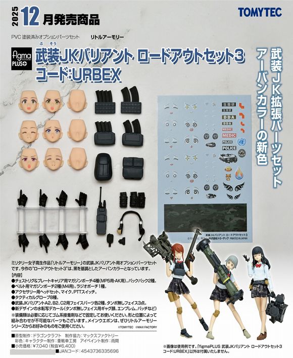 ミリタリー女子高生作品「リトルアーモリー」の武装JKバリアント用オプションパーツセットです。今作の“ロードアウトセット3”は、黒を基調としたアーバンカラーとなっています。