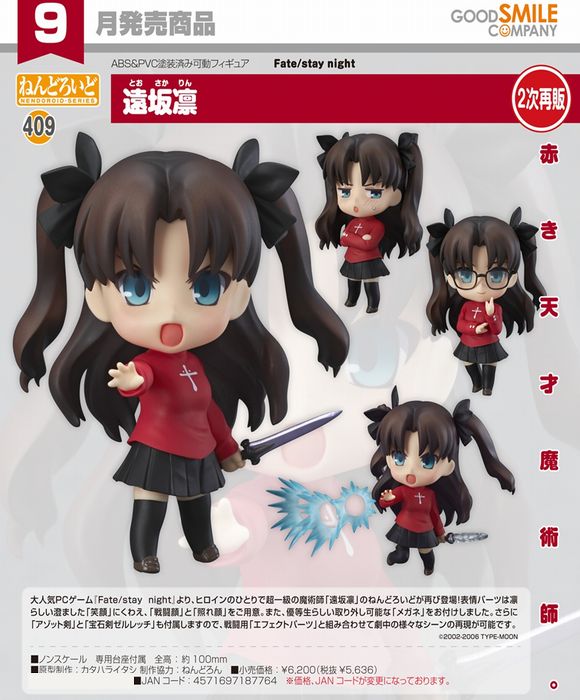 大人気PCゲーム『Fate/stay night』より、ヒロインのひとりで超一級の魔術師「遠坂凛」のねんどろいどが再び登場!表情パーツは凛らしい澄ました「笑顔」にくわえ、「戦闘顔」と「照れ顔」をご用意。また、優等生らしい取り外し可能な「メガネ」をお付けしました。さらに「アゾット剣」と「宝石剣ゼルレッチ」も付属しますので、戦闘用「エフェクトパーツ」と組み合わせて劇中の様々なシーンの再現が可能です。