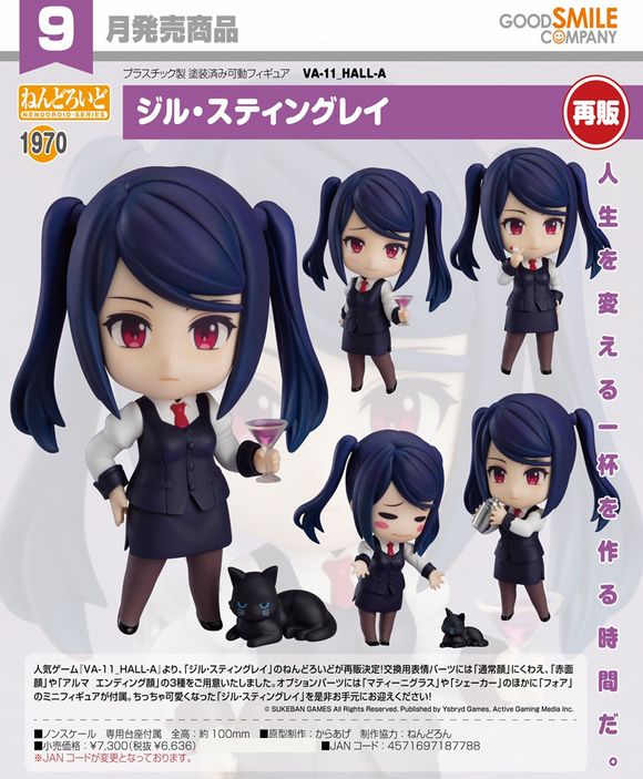 人気ゲーム『VA-11_HALL-A』より、「ジル・スティングレイ」のねんどろいどが再販決定!交換用表情パーツには「通常顔」にくわえ、「赤面顔」や「アルマ エンディング顔」の3種をご用意いたしました。オプションパーツには「マティーニグラス」や「シェーカー」のほかに「フォア」のミニフィギュアが付属。ちっちゃ可愛くなった「ジル・スティングレイ」を是非お手元にお迎えください!