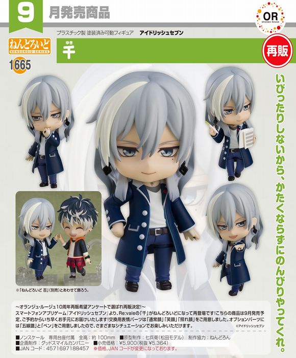 スマートフォンアプリゲーム『アイドリッシュセブン』より、Re:valeの「千」がねんどろいどになって再登場です!こちらの商品は9月発売予定、ご予約からいち早くお手元にお届けいたします!交換用表情パーツは「通常顔」「笑顔」「照れ顔」をご用意しました。オプションパーツには「五線譜」と「ペン」をご用意しましたので、さまざまなシチュエーションでお楽しみいただけます。ちっちゃかわいくなったユキくんをぜひお手元にお迎えください♪「ねんどろいど 百」(別売)もご予約受付中です。