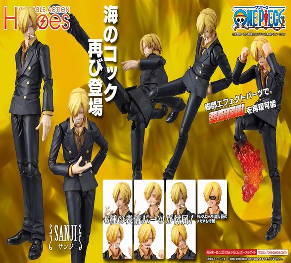 ヴァリアブルアクションヒーローズにサンジが再登場です。黒いスーツ姿の颯爽としたイメージ通りのプロポーションに、各部広い可動領域を備え劇中印象的なポージングが可能。表情パーツは6種付属し、様々なシチュエーションに合わせた表情が再現できます。また、ドレスローザ潜入時にかけていたメガネも付属し、普段とは違った表情も楽しめます。さらに、右足には差し替えでエフェクト付きの脚も付属し「悪魔風脚(ディアブルジャンブ)」などの必殺技発動イメージも再現可能です。リアルな造形再現と塗装を施し、飾っても触っても楽しむことができる商品です。