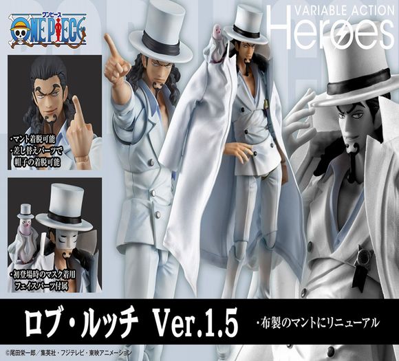ヴァリアブルアクションヒーローズにエニエス・ロビーでルフィと激しい戦いを繰り広げたロブ・ルッチがサイファーポール”イージス”ゼロとなって再び登場した姿での商品化です。白いスーツとマントに身を包み、只者ならぬ風格を漂わせた雰囲気をイメージ通りに再現。各部広い可動領域を備え、劇中印象的なポージングが可能。オプションとして、マントは着脱可能で、帽子も差し替えパーツで着脱を再現、表情パーツは2種と初登場時のマスク付きのフェイスも付属し、様々なシチュエーションが再現できます。リアルな造形再現と塗装を施し、飾っても触っても楽しむことができる商品です。