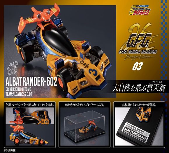 TVアニメ「新世紀GPXサイバーフォーミュラ」より、`オフロードの鬼`とも呼ばれる大友譲二が駆るアルバトランダー602が、サイバーフォーミュラコレクション-Heritage Edition-シリーズに登場です! オフロード車らしいシャシーのメカニカルな機構や、車体上部の鳥型メカ「バードサーチャー」も、細かい造形と微細なマーキングを組み合わせ実感のある仕上がりで再現しております。 実際のレーシングカーを髣髴とさせる細かいマーキングと、深みのある美麗な彩色が組み合わさり、小さいながらもリアリティと高級感を感じられる一品となりました。 上下にスタッキングできる専用ディスプレイケースや、銘板調ホイルステッカー等、より一層コレクションとディスプレイをお楽しみいただけるセット内容となっております。 小さいサイズに多くの魅力が詰まった-Heritage Edition-を是非お手にとってお楽しみください。