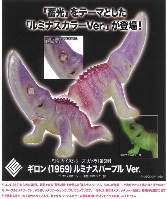 《ミドルサイズシリーズ》 「古そうで新しい、だけど少し古臭いソフビ怪獣シリーズ」をコンセプトに、シリーズ全高12cmほどの、手のひらに収まる集めやすいサイズで、 ノスタルジーさを感じさせてくれる、どことなく「昭和レトロ」を感じるレトロテイストのデフォルメが施された、ソフビ好き・怪獣好きにCCPJAPANが送るコレクションシリーズ。 ミドルサイズシリーズ ガメラに第6弾が登場!今回は「蓄光」をテーマとした「ルミナスカラーVer.」で5種がラインナップ。ソフビ原型は、二郎工房。ヘッダーデザインは、イラストレーター八重樫紀史氏による描き下ろしヘッダー。 本体仕様 彩色済み完成品 梱包 仕様 PP袋、紙ヘッダー 材質 PVC(ソフビ製) サイズ 全高約10cm 対象年齢 15歳以上 (C)KADOKAWA NH/1995