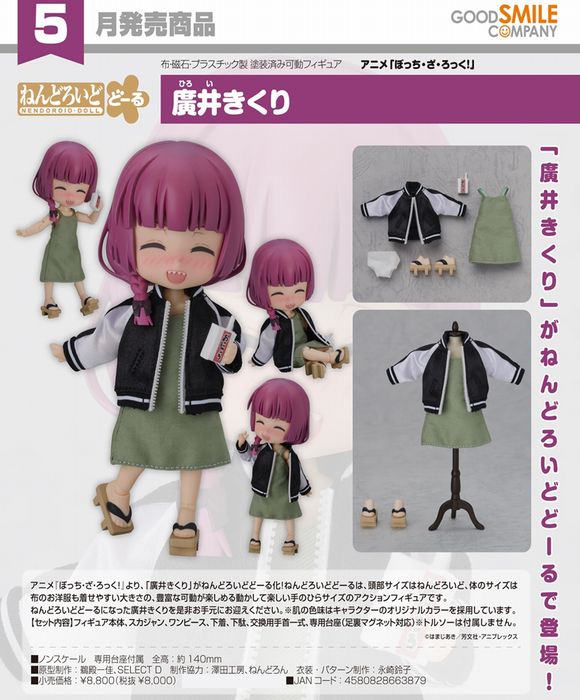 アニメ『ぼっち・ざ・ろっく!』より、「廣井きくり」がねんどろいどどーる化!ねんどろいどどーるは、頭部サイズはねんどろいど、体のサイズは布のお洋服も着せやすい大きさの、豊富な可動が楽しめる動かして楽しい手のひらサイズのアクションフィギュアです。ねんどろいどどーるになった廣井きくりを是非お手元にお迎えください。