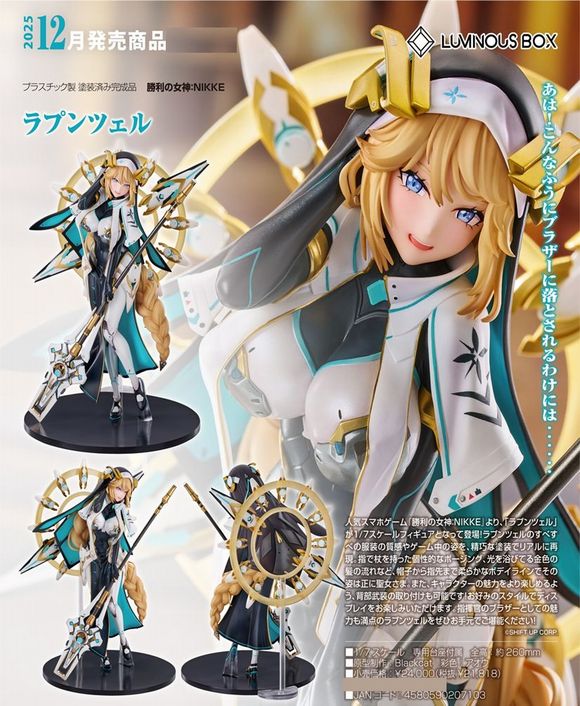 人気スマホゲーム『勝利の女神:NIKKE』より、「ラプンツェル」が1/7スケールフィギュアとなって登場!ラプンツェルのすべすべの服装の質感やゲーム中の姿を、精巧な塗装でリアルに再現。指で杖を持った個性的なポージング、光を浴びてる金色の髪の流れなど、帽子から指先まで柔らかなボディラインでその姿は正に聖女さま。また、キャラクターの魅力をより楽しめるよう、背部武装の取り付けも可能です!お好みのスタイルでデイスプレイをお楽しみいただけます。指揮官のブラザーとしての魅力も満点のラプンツェルをぜひお手元でご堪能ください!