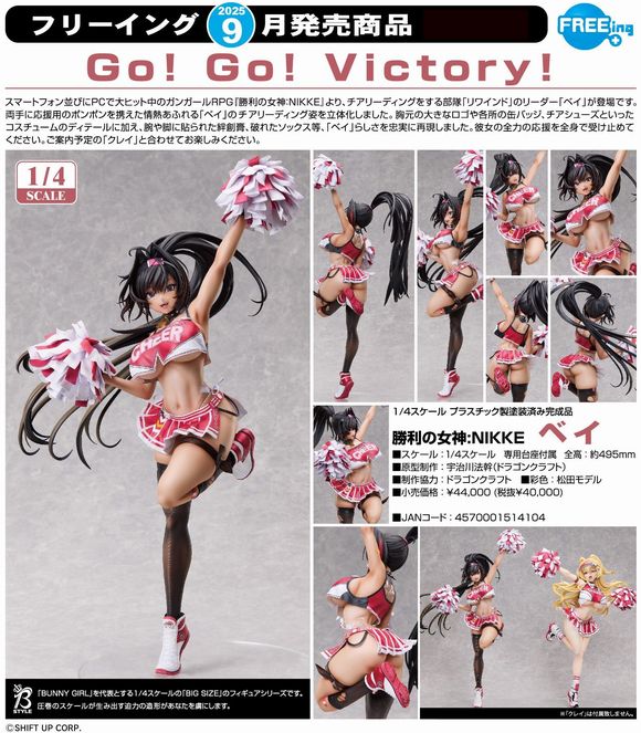 スマートフォン並びにPCで大ヒット中のガンガールRPG『勝利の女神:NIKKE』より、チアリーディングをする部隊「リワインド」のリーダー「ベイ」が登場です。両手に応援用のポンポンを携えた情熱あふれる「ベイ」のチアリーディング姿を立体化しました。胸元の大きなロゴや各所の缶バッジ、チアシューズといったコスチュームのディテールに加え、腕や脚に貼られた絆創膏、破れたソックス等、「ベイ」らしさを忠実に再現しました。彼女の全力の応援を全身で受け止めてください。ご案内予定の「クレイ」と合わせてお楽しみください。