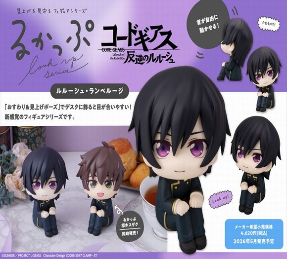るかっぷシリーズよりTVアニメ『コードギアス 反逆のルルーシュ』の「ルルーシュ・ランペルージ」が登場です!「るかっぷ」は「look up(見上げる)」を元にした造語で、あなたを見上げて見つめているような仕草が特長の人気フィギュアシリーズです。 「見上げ&おすわりポーズ」で、デスクの上などに飾ったとき、通常のフィギュアと比べて目が合いやすくなっています。首は可動で表情をつけて楽しむことができ、全高約110mmでボリューム感もたっぷりです。 お部屋に飾れば、ルルーシュ・ランペルージがそこにいるかのような存在感を楽しめます。「ルルーシュ・ランペルージ」「枢木スザク」が同時発売で、一緒に並べると世界観が広がります。