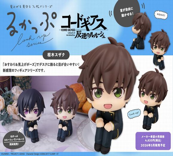 るかっぷシリーズよりTVアニメ『コードギアス 反逆のルルーシュ』の「枢木スザク」が登場です!「るかっぷ」は「look up(見上げる)」を元にした造語で、あなたを見上げて見つめているような仕草が特長の人気フィギュアシリーズです。 「見上げ&おすわりポーズ」で、デスクの上などに飾ったとき、通常のフィギュアと比べて目が合いやすくなっています。首は可動で表情をつけて楽しむことができ、全高約110mmでボリューム感もたっぷりです。 お部屋に飾れば、枢木スザクがそこにいるかのような存在感を楽しめます。「ルルーシュ・ランペルージ」「枢木スザク」が同時発売で、一緒に並べると世界観が広がります。