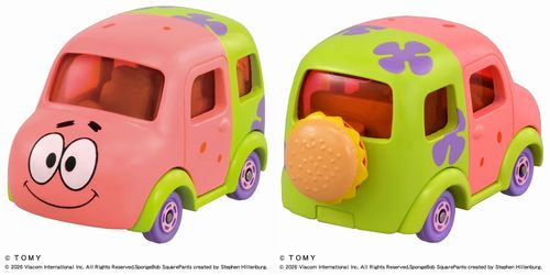 ドリームトミカに「スポンジ・ボブ」のパトリックが登場! 「スポンジ・ボブ」の「パトリック」がトミカになった!リア部分にはリアタイヤの代わりに"カーニバーガー"が付いています。 <アクション>サスペンション (C) TOMY (C) 2026 Viacom International Inc. All Rights Reserved. Nickelodeon, SpongeBob SquarePants and all related titles, logos and characters are trademarks of Viacom International Inc. SpongeBob SquarePants created by Stephen Hillenburg.