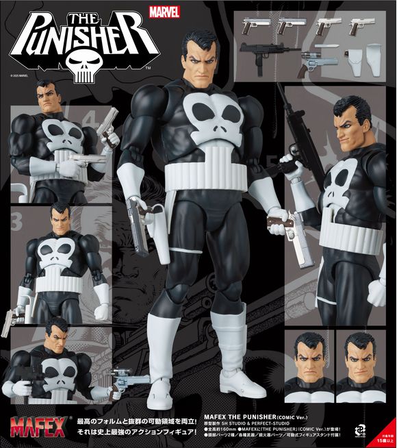最高のフォルムと抜群の可動領域を両立! 史上最強のアクションフィギュア! 2026年6月発売予定 マフェックス No.136 MAFEX THE PUNISHER(COMIC Ver.) 参考小売価格¥14,080(税込) 原型製作 SH STUDIO & PERFECT-STUDIO ●全高約160mm ●MAFEXに「THE PUNISHER」(COMIC Ver.)が登場! ●頭部パーツ2種/各種武器/銃火器パーツ/可動式フィギュアスタンド付属! ※監修中のサンプルを撮影しております。 発売商品とは異なる場合がございます。 (C) 2025 MARVEL