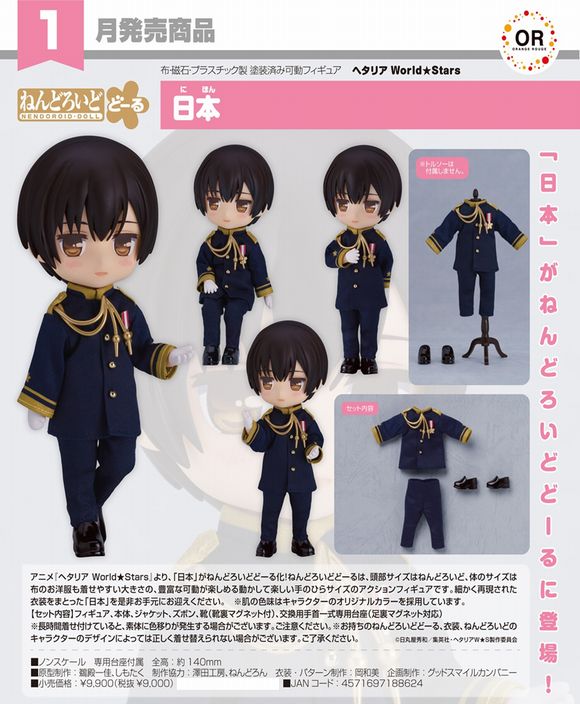 アニメ『ヘタリア World★Stars』より、「日本」がねんどろいどどーる化!ねんどろいどどーるは、頭部サイズはねんどろいど、体のサイズは布のお洋服も着せやすい大きさの、豊富な可動が楽しめる動かして楽しい手のひらサイズのアクションフィギュアです。細かく再現された衣装をまとった「日本」を是非お手元にお迎えください。