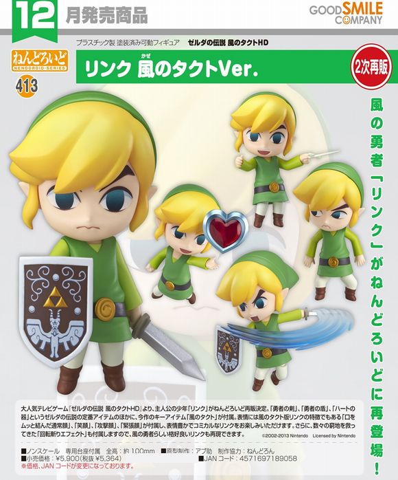 大人気テレビゲーム『ゼルダの伝説 風のタクトHD』より、主人公の少年「リンク」がねんどろいど再販決定。「勇者の剣」、「勇者の盾」、「ハートの器」というゼルダの伝説の定番アイテムのほかに、今作のキーアイテム「風のタクト」が付属。表情には風のタクト版リンクの特徴でもある「口をムッと結んだ通常顔」、「笑顔」、「攻撃顔」、「緊張顔」が付属し、表情豊かでコミカルなリンクをお楽しみいただけます。さらに、数々の窮地を救ってきた「回転斬りエフェクト」も付属しますので、風の勇者らしい格好良いリンクも再現できます。