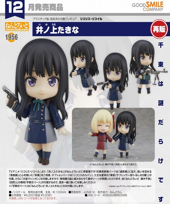 TVアニメ『リコリス・リコイル』より、「井ノ上たきな」がねんどろいどに再登場です!交換用表情パーツは「通常顔」に加え、狙いを定める「真剣顔」と心を開いた「笑顔」をご用意。オプションパーツは「リコリスのカバン」、たきな愛用の「拳銃(サプレッサーあり・なしの2種)」が付属。さらに「大型マシンガン」も付属しますので、専用構え腕と組み合わせて劇中シーンが再現いただけます。他「ねんどろいど 錦木千束」(別売)との専用「手繋ぎパーツ」が付属するので、是非一緒に飾ってお楽しみください!