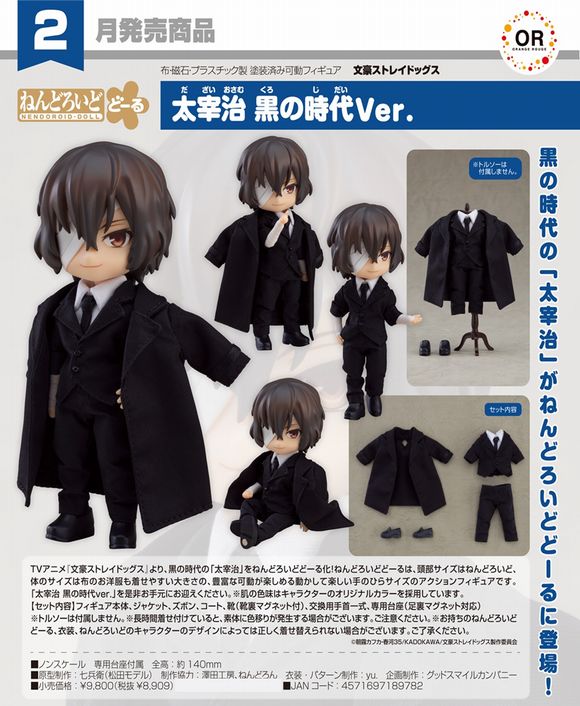 TVアニメ『文豪ストレイドッグス』より、黒の時代の「太宰治」をねんどろいどどーる化!ねんどろいどどーるは、頭部サイズはねんどろいど、体のサイズは布のお洋服も着せやすい大きさの、豊富な可動が楽しめる動かして楽しい手のひらサイズのアクションフィギュアです。「太宰治 黒の時代ver.」を是非お手元にお迎えください。