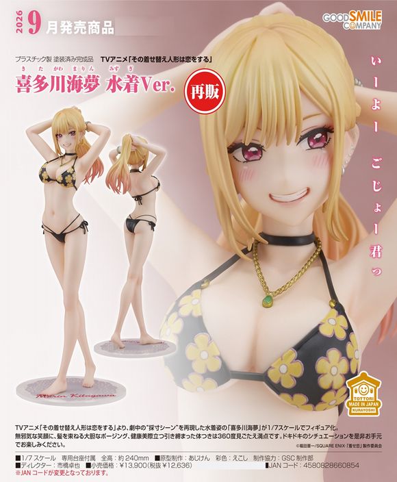TVアニメ「その着せ替え人形は恋をする」より、劇中の“採寸シーン”を再現した水着姿の「喜多川海夢」が1/7スケールでフィギュア化。無邪気な笑顔に、髪を束ねる大胆なポージング、健康美際立つ引き締まった体つきは360度見ごたえ満点です。ドキドキのシチュエーションを是非お手元でお楽しみください。