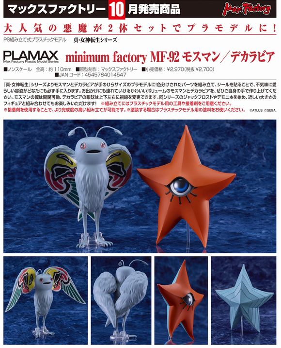 『真・女神転生』シリーズよりモスマンとデカラビアが手のひらサイズのプラモデルに!色分けされたパーツを組み立て、シールを貼ることで、不気味に愛らしい容姿がどなたにも必ず手に入ります。お出かけにも連れていけるかわいいボリュームのモスマンとデカラビアを、ぜひご自身の手で作り上げてください。モスマンの翼は開閉可動、デカラビアの眼球は上下左右に視線を変更できます。同シリーズのジャックフロストやデモニホを始め、近しい大きさのフィギュアと組み合わせてもお楽しみいただけます!