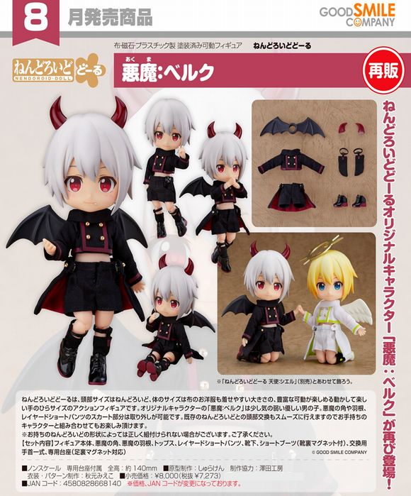 ねんどろいどどーるは、頭部サイズはねんどろいど、体のサイズは布のお洋服も着せやすい大きさの、豊富な可動が楽しめる動かして楽しい手のひらサイズのアクションフィギュアです。オリジナルキャラクターの「悪魔:ベルク」は少し気の弱い優しい男の子。悪魔の角や羽根、レイヤードショートパンツのスカート部分は取り外しが可能です。既存のねんどろいどとの頭部交換もスムーズに行えますのでお手持ちのキャラクターと組み合わせてもお楽しみ頂けます。