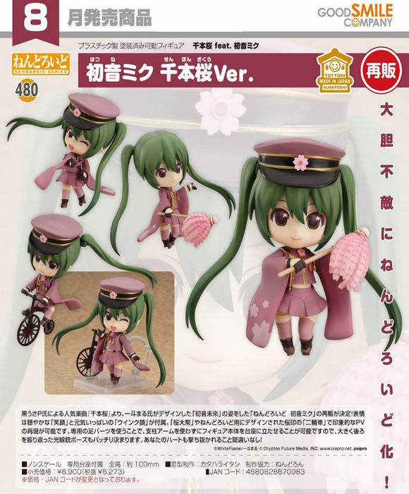 黒うさP氏による人気楽曲『千本桜』より、一斗まる氏がデザインした「初音未來」の姿をした「ねんどろいど 初音ミク」の再販が決定!表情は穏やかな「笑顔」と元気いっぱいの「ウインク顔」が付属。「桜大幣」やねんどろいど用にデザインされた桜印の「二輪車」で印象的なPVの再現が可能です。専用の足パーツを使うことで、支柱アームを使わずにフィギュア本体を台座に立たせることが可能ですので、大きく後ろを振り返った光線銃ポーズもバッチリ決まります。あなたのハートも撃ち抜かれること間違いなし!